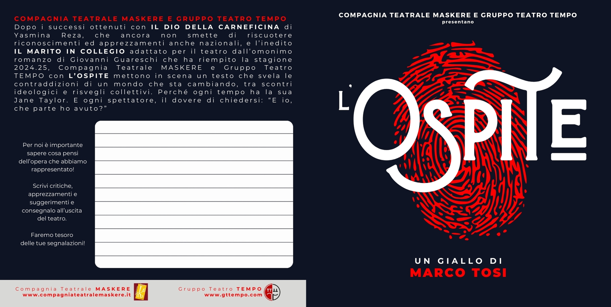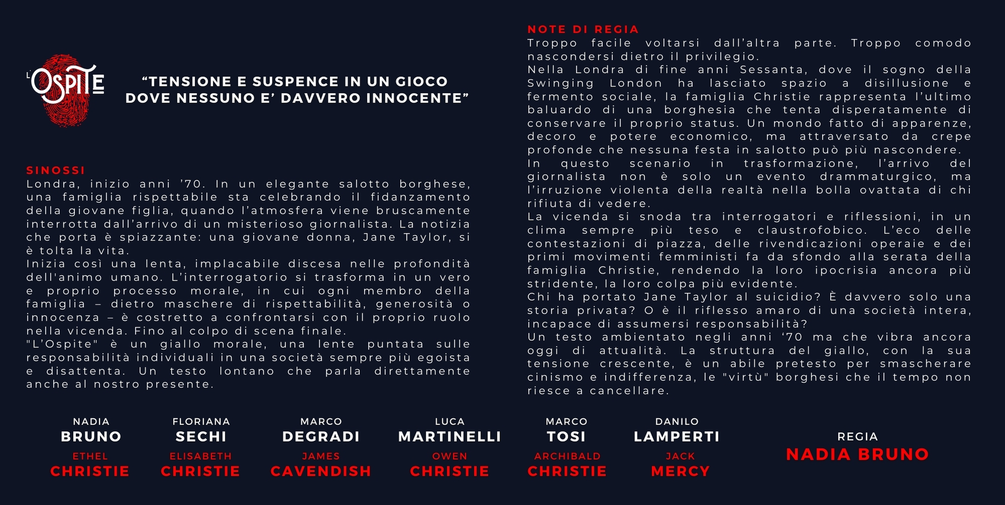 Dopo i successi ottenuti con IL DIO DELLA CARNEFICINA di Yasmina Reza, che ancora non smette di riscuotere riconoscimenti ed apprezzamenti anche nazionali, e l’inedito IL MARITO IN COLLEGIO adattato per il teatro dall’omonimo romanzo di Giovanni Guareschi che ha riempito la stagione 2024.25, Compagnia Teatrale MASKERE e Gruppo Teatro TEMPO con L'OSPITE mettono in scena un testo che svela le contraddizioni di un mondo che sta cambiando, tra scontri ideologici e risvegli collettivi. Perché ogni tempo ha la sua Jane Taylor. E ogni spettatore, il dovere di chiedersi: “E io, che parte ho avuto?”
